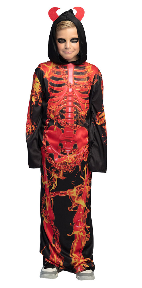 Ein robustes Teufelskostüm für Jungen im Alter von 10-12 Jahren. Das Horrorkostüm für Kinder besteht aus einem Gewand mit rotem Skelett und Flammenmuster. An der Kapuze des Kinderkostüms befinden sich Teufelshörner für den Teufelslook. Ideal für Kinder, die sich zu Halloween verkleiden wollen.