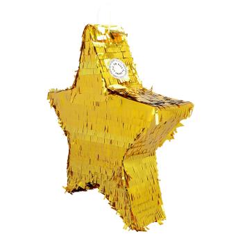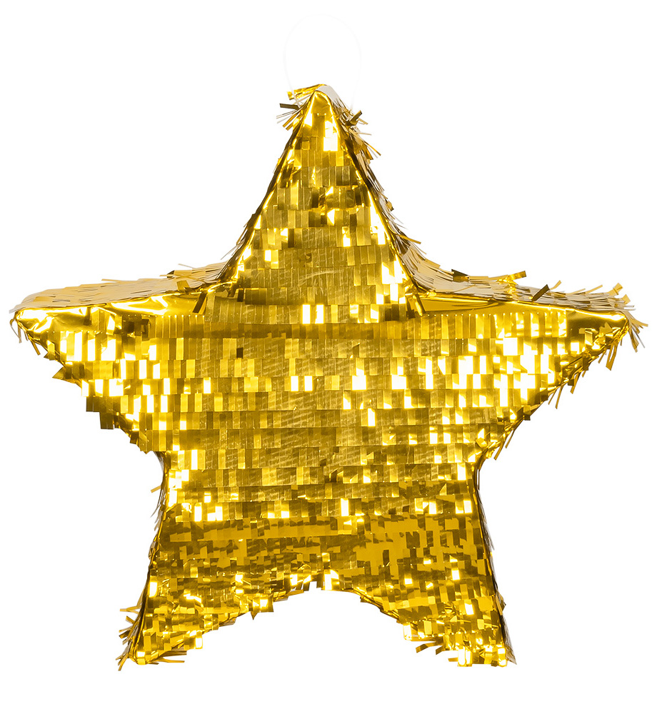 Die Pinata misst 44 x 44 cm, ist aus stabilem Papier gefertigt, in funkelndem Gold gestaltet und lässt sich individuell mit Süssigkeiten oder kleinen Überraschungen befüllen.