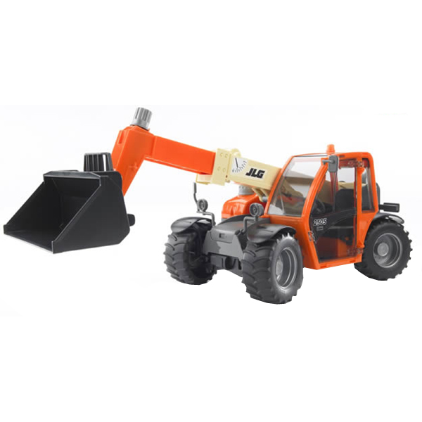 Der JLG Teleskoplader ist ein wahres Multitalent. Ob es um das Schaufeln von grossen Erdmassen, oder um das Verladen von empfindlichen Gütern auf Paletten geht, jederzeit ist der JLG Teleskoplader ein zuverlässiger und effektiver Partner. Gerade seine geringen Abmessungen in Kombination mit dem weit ausfahrbaren Teleskoparm machen ihn oft zur ersten Wahl in den unterschiedlichsten Einsatzgebieten. Über vier silbern hervorgehobene Drehgriffe funktioniert die präzise Steuerung des JLG-Modells. Neben den Funktionen wie verstellen der Armhöhe, ausfahren des Arms und der Winkelverstellung der Werkzeugaufnahme verfügt der Teleskoplader über eine gut arbeitende Vierradlenkung. Diese Lenkung des JLG Teleskopladers macht das Handling des Fahrzeuges, sowohl beim Original, als auch bei dem Modell von BRUDER, zu einem Kinderspiel.