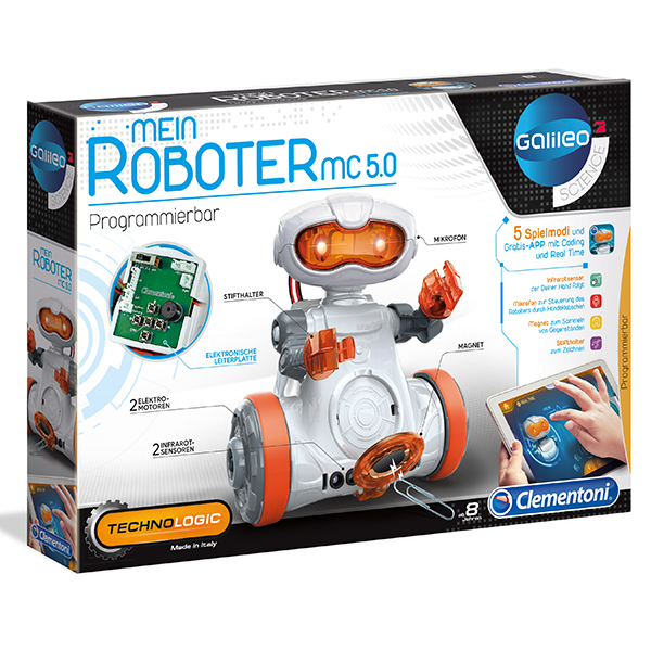 Mein Roboter mc 5.0 D. Ein einzigartiger und origineller Roboter zum Zusammenbauen, mit vielen unterhaltsamen Spielmodi! Dank zweier Infrarotsensoren kann der neue Roboter Hindernissen ausweichen und deiner Hand wie ein echter Bluthund folgen. Du kannst das Mikrofon verwenden, um ihn zu steuern, indem du einfach in die Hände klatschst. Über die Drucktaste am Rücken des Roboters kannst du seine Route programmieren. Die kostenlose App verfügt über zwei Spielabschnitte: Codierung, um die Prinzipien der blockbasierten Programmierung zu erlernen, und Echtzeit, um Bewegungen, Geräusche und Lichteffekte so zu steuern, als ob du eine echte Fernbedienung verwenden würdest. Zuletzt kannst du den Roboter mit dem Markerhalter bzw. dem Magnethalter zeichnen lassen oder ihn so programmieren, dass er nach kleinen Münzen und Büroklammern sucht.