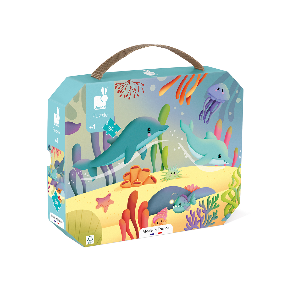 36-teiliges FSC™-zertifiziertes Papp-Puzzle mit Poster zum Thema Unterwasserwelt. Spielerisch Meeresbewohner und Pflanzen entdecken, Geduld und Feinmotorik fördern. Hergestellt in Frankreich mit pflanzlichen Farben, im praktischen Koffer für Kinder ab 4 Jahren.