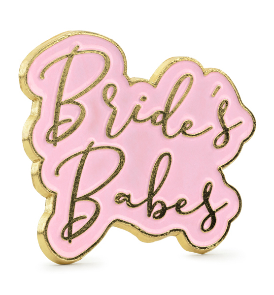 Anstecker Bride's Babes aus goldfarbigem Metall mit rosa Aufdruck, Maße ca. 3,5 x 3 cm.