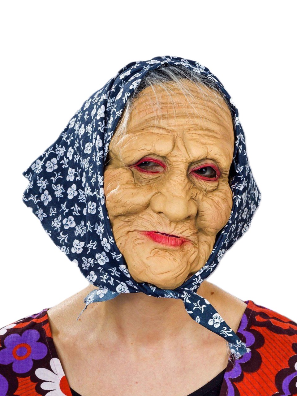 This full-face latex mask depicts an old woman or a friendly-looking witch. It features a headscarf with a hairline made of long-pile plush.