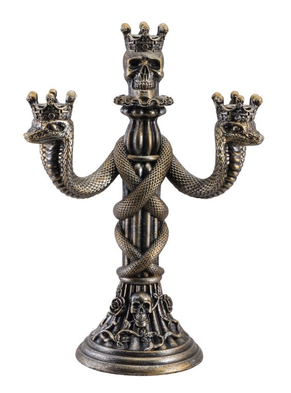 A captivating bronze chandelier featuring a skull and two snake heads. Ideal for spooky decorations or themed parties that add a touch of mystique and gothic aesthetics!