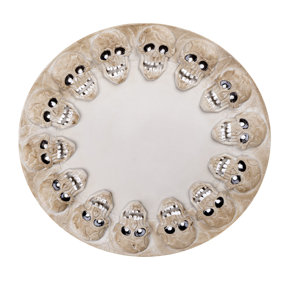 This large tray in the shape of a skull is not only a practical helper, but also a gloomy decorative highlight. Measuring 38 x 40 cm, it offers enough space to present snacks, drinks or Halloween treats in style. Perfect for emphasising the atmosphere of a spooky night and casting a spell over your guests!