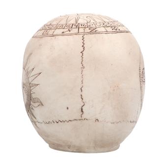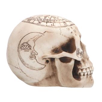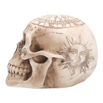 Ein besonderer Dekorationsschädel mit magischen Zeichen aus der Mythologie. Der gruselige Schädel ist aus hartem Material gefertigt. Eine schöne Halloween-Dekoration, mit der man das Haus oder den Tisch zu Halloween dekorieren kann. Vor allem, wenn das Thema ‚Hexen‘ ist.