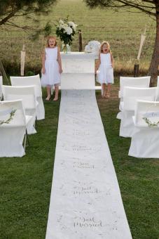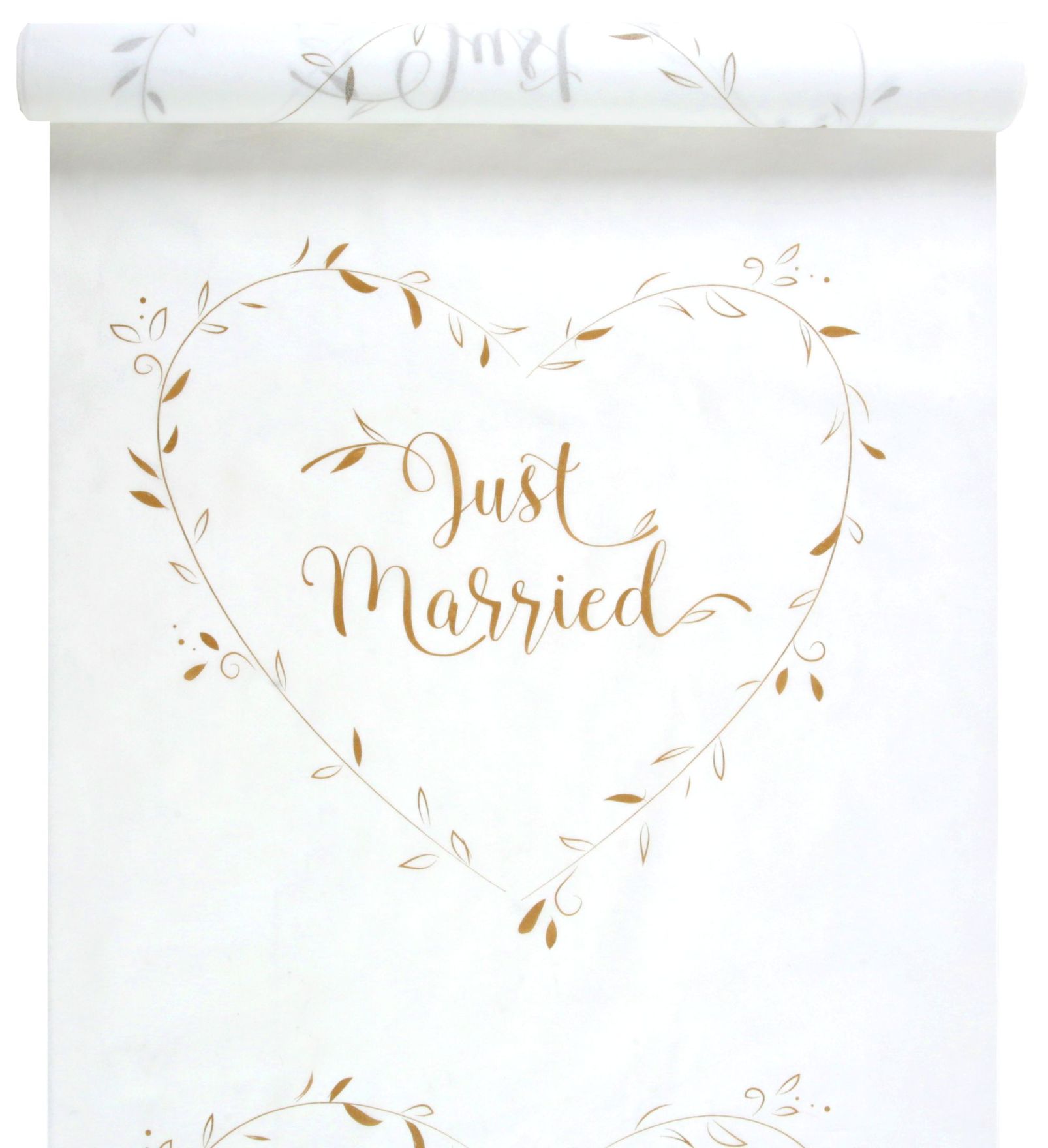 White Just Married wedding aisle runner – 10m with gold heart lettering