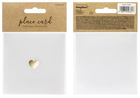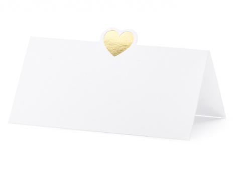 10 Tischkarten aus weißem Papier, mit einem goldmetallisierten Herz, Maße nach dem Falten ca. 10 x 5 cm.