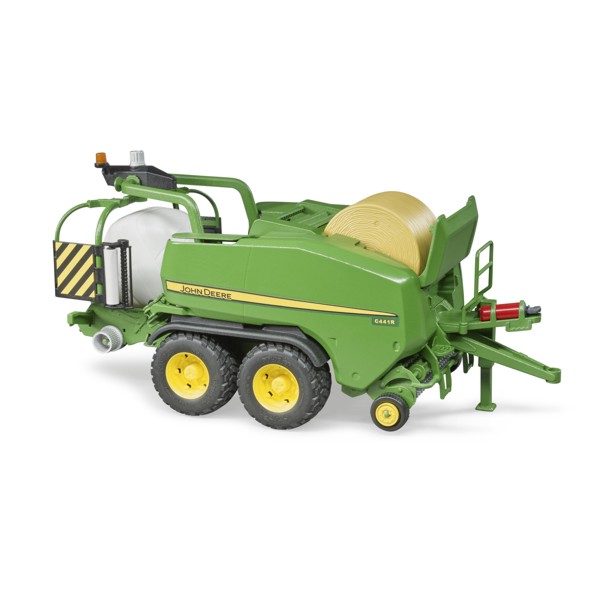 John Deere ist schon seit langem nicht nur für seine Traktoren bekannt, sondern auch für seine innovativen Erntemaschinen. Die Kombipresse C441R ist der ideale Helfer für das Ernten von Stroh und Heu. Mit modernster Press- und Fördertechnik hat diese Presswickelkombination eine Ausbringung von bis zu 60 Ballen pro Stunde. Dieses fantastische Erntegerät gibt es nun neu in der Themenwelt Landwirtschaft bei BRUDER. Dabei wurde wieder auf höchste Detailtreue und Funktionalität geachtet. Der funktionierende Pickup ist beweglich und höhenverstellbar. Durch die Klappe an der Oberseite können kleine Landwirte den mitgelieferten Strohballen einlegen. Mit dem neu entwickelten Fördersystem können die Strohballen vom Pressraum auf die Wickeleinrichtung transportiert werden und der drehbare Folienwickler schließt den Erntevorgang ab. Für noch mehr Nähe zum Vorbild ist auch ein fertig eingewickelter Strohballen enthalten. Dieses tolle, neue Modell von BRUDER passt an alle Traktoren der 2000er und 3000er Serie. Für noch mehr Spielspass kann das Zubehör Rundballen (Art.-Nr. 310.02345) hinzugefügt werden.