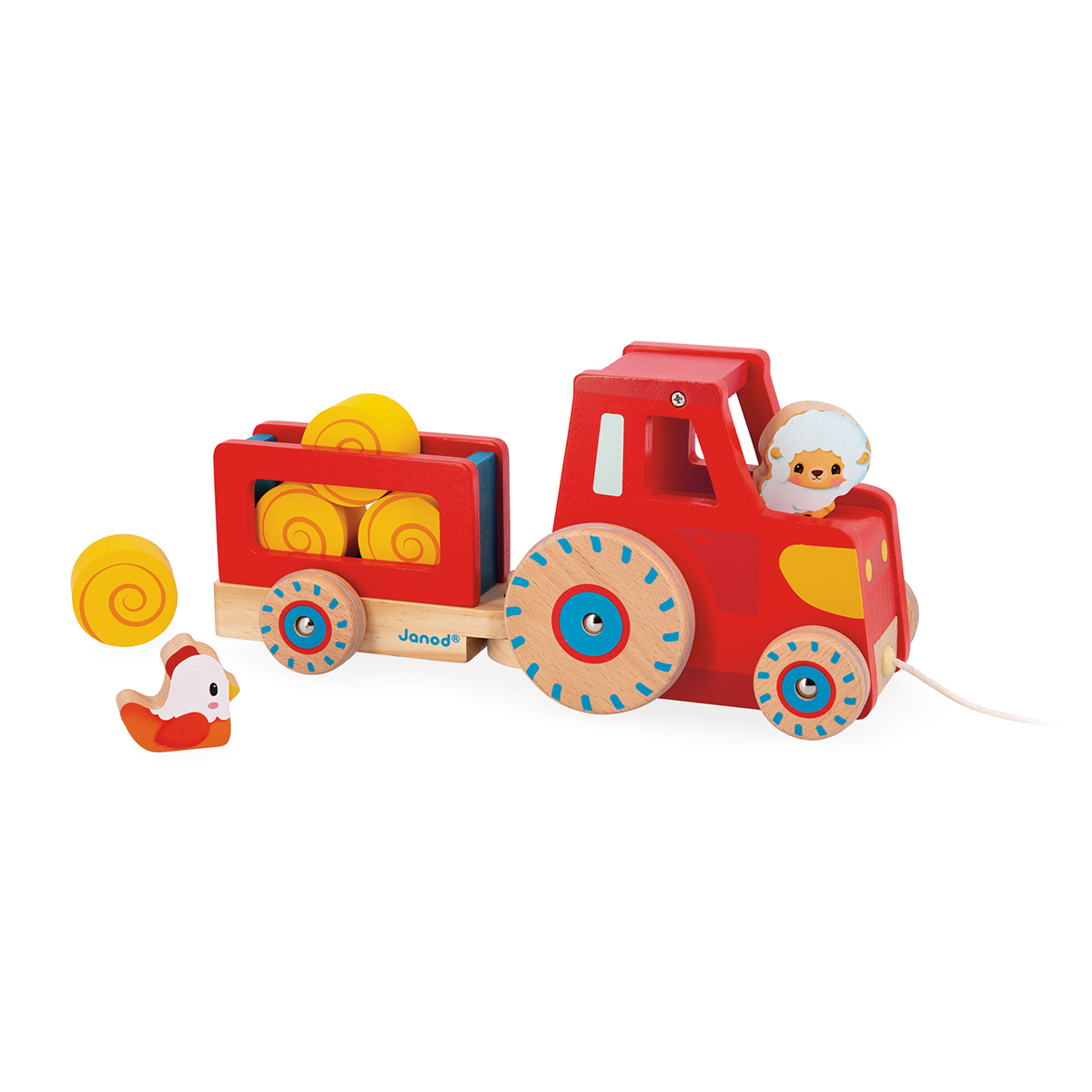 Colorful wooden tractor with removable trailer and clacking beads. Enhances fine motor skills and walking behavior. Suitable from 1 year.