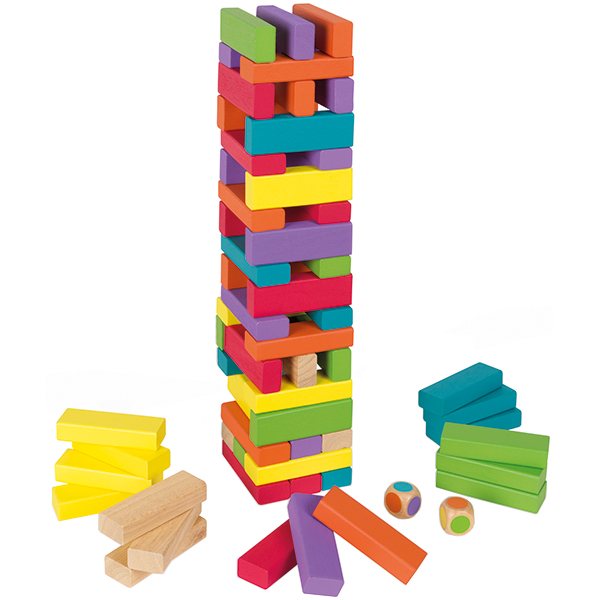 Holzspielzeug für Kinder von 3 bis 10 Jahre. Ziel des Spiels ist es, der Letzte zu sein, der einen Holzbaustein bewegt, ohne dass der Turm einstürzt.