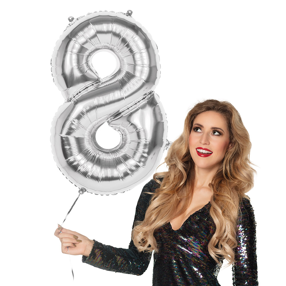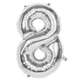 Silberner Folienballon Zahl 8, Höhe 86 cm.