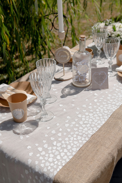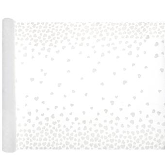 Beau chemin de table blanc décoré avec des cœurs blancs et des dimensions de 3m de longueur et 48cm de largeur, pour une décoration festive pour les mariages et autres occasions.