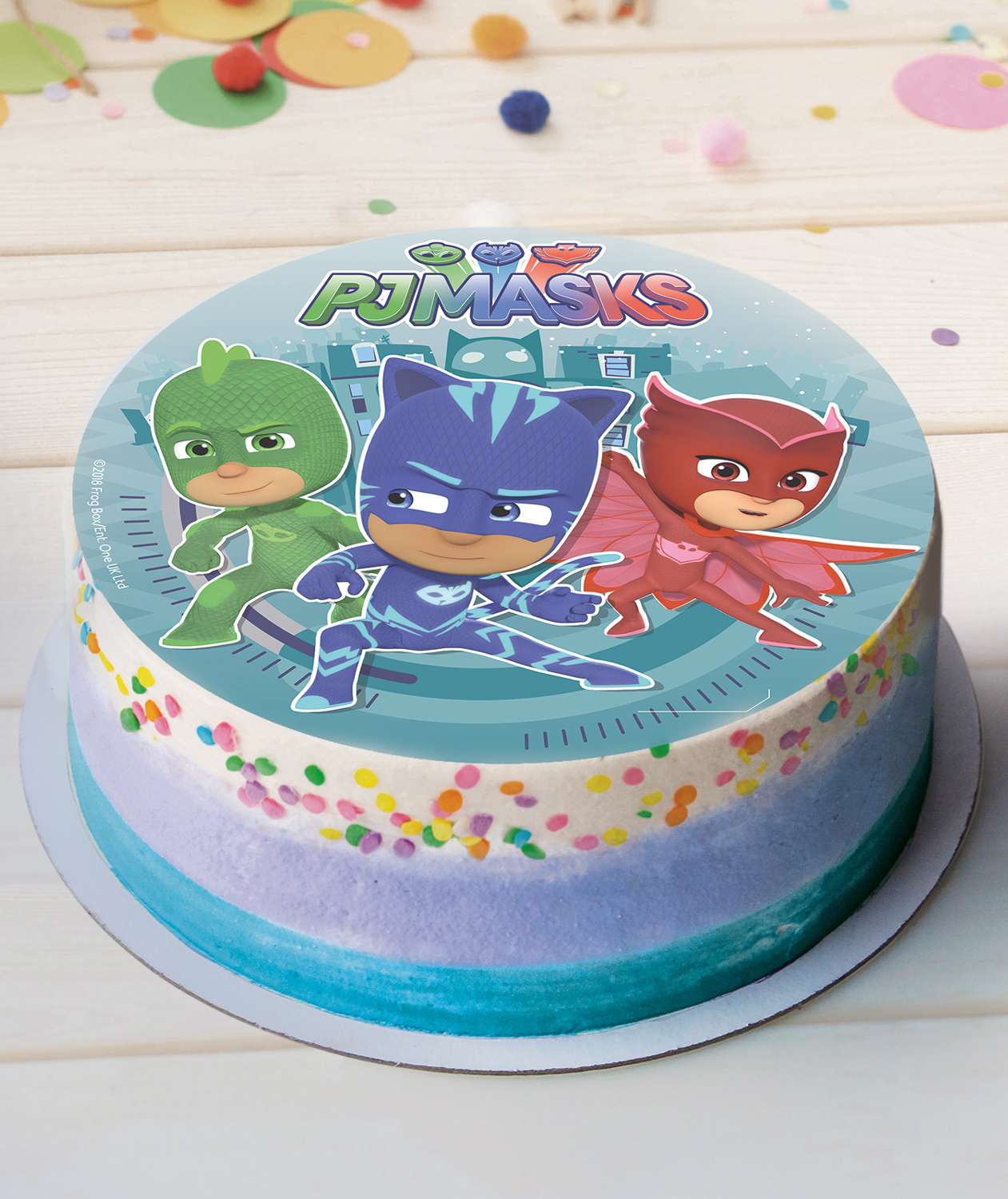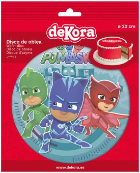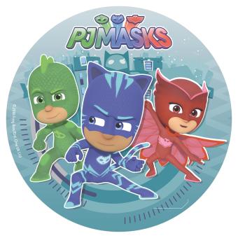 Der Tortenaufleger hat eine Abmessung von 20 cm, was ihn ideal für mittelgroße bis große Kuchen macht. Er wird auf der Oberfläche der Torte platziert und verleiht ihr ein farbenfrohes und ansprechendes Design im PJ Masks Thema.