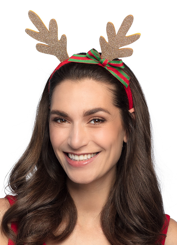 Diadème doré pailleté avec détails festifs pour un Noël magique.