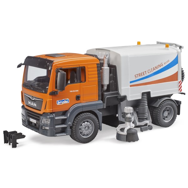 Strassenreinigungen sind ein unverzichtbarer Helfer für jede Stadtverwaltung und gehören zum alltäglichen Stadtbild. Kein anderes Fahrzeug sorgt so effizient für saubere Strassen und Gehwege. Die neue Strassenreinigung von BRUDER zeigt in höchstem Masse detailgetreu die Funktionsweise dieses spannenden LKW’s. Der MAN TGS ist der perfekte Partner. Robust gebaut, mit durchzugsstarken Motoren mit bis zu 500 PS ausgestattet und mit einer überdurchschnittlichen Nutzlast ist dieser LKW der Prototyp für den viel beschriebenen Alleskönner. Der Kehrmaschinenaufbau besitzt 2 rotierende und verstellbare Reinigungsbürsten die auch in der Höhe anpassbar sind. Damit erreichen sie auch schwer zugängliche Bereiche. Für die Reinigung von Flächen ist unter dem Fahrzeug eine Langbürste montiert, welche bei der Fahrt angetrieben wird. Am Heck befindet sich der flexible Schlauch samt Saugrohr zur Aufnahme grösserer Mengen Schmutz. Zur Entleerung des Abfallkorpus, lässt sich dieser einfach kippen und die Heckklappe öffnen. Im gekippten Zustand zeigt sich auch die beeindruckende Sauganlage des Fahrzeugs. Optional kann die Strassenreinigung mit einem Light & Sound Modul ausgestattet werden (Art.-Nr. 310.02801 / 310.02802). Aus der umfangreichen bworld Themenwelt können Kinder den bworld Kommunalarbeiter (Art.-Nr. 310.62130) wunderbar dazu kombinieren, da dieser den Spielwert nochmals eindrucksvoll erweitert.