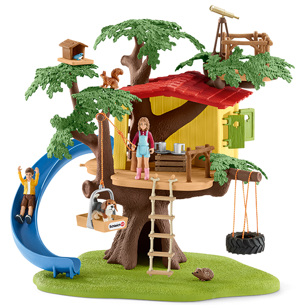 Im Schleich Baumhaus können die beiden Kinder der Bauernfamilie Sarah und Ben stundenlang toben, spielen und picknicken. Wer hat noch nicht von einem eigenen Baumhaus geträumt? Das Set beinhaltet viele Funktionen für langanhaltenden Spielspaß. Während Ben auf der Aussichtsplattform die Tiere beobachtet, rutscht Sarah die Rutsche herunter. Der Hundewelpe wartet schon auf sie. Über die Leiter kann Sarah zurück ins Baumhaus gelangen. Mithilfe des Flaschenzugs kann der süße Beagle-Welpe ganz leicht nach oben ins gemütliche Baumhaus gebracht werden. So können alle gemeinsam spielen. In der Höhle im Baumstamm hat auch der Igel sein eigenes Zuhause und auch der kleine Vogel liebt sein eigenes Reich im Laub. Mit 2 menschlichen Figuren, 4 Tieren und tollem Zubehör. Das Set ist die ideale Ergänzung zum separat erhältlichen großen 42407 Bauernhaus mit Stall und Tieren.