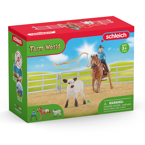 Yee-haw! Sattle den Quarter Horse Hengst auf?… es wird Zeit für ein bisschen Rodeotraining! Schnapp dir das Lasso und zeig, was du drauf hast. Das Spielset - Team Roping mit Cowgirl von Schleich? Farm World beinhaltet ein Texas Longhorn Kalb mit Sonderbemalung, ein Quarter Horse, ein Cowgirl, Zaunelemente, einen Sattel und natürlich ein Lasso. Empfohlen für Cowgirls, Cowboys und Ranch-Gehilfen ab 3?Jahren.